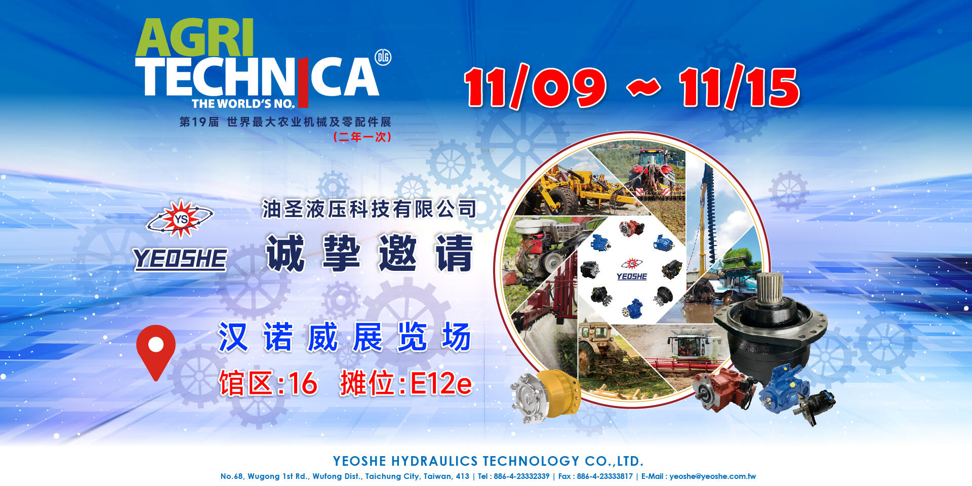 我们将于2025.11.09 (日) ~ 2025.11.15 (六)参加德国农机展。位于汉诺威展览场我们在 16馆,摊位E12e。油圣液压有限公司诚挚邀请。